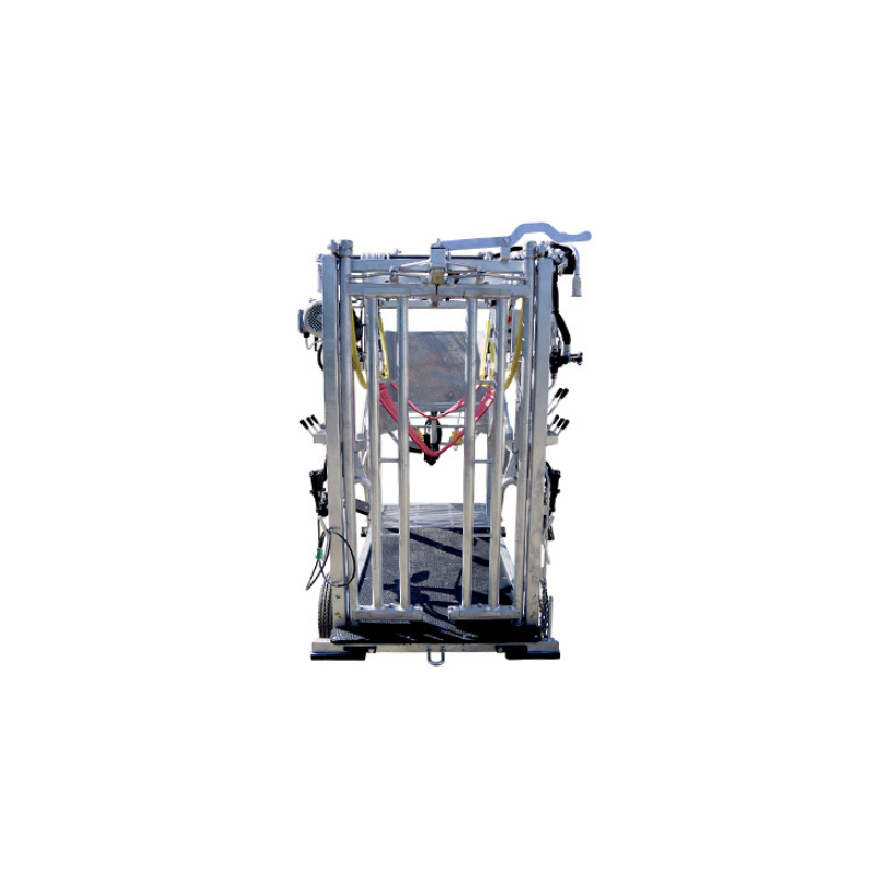 The model 650-SP2 is equipped with the essential hydraulic functions. The legs of the cow are lifted with help from the hydraulic winches and placed on the hoof support plates. During the lifting process the leg sleeves allow for an easy and gentle fixation. The hydraulic double belly band system provides comfort and stability for the livestock during treatment. The double belly band system also offers the possibility of using the chute for other treatment purposes.